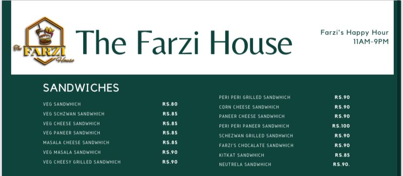 The menu at The Farzi House is a delightful fusion of flavors, featuring a variety of options to satiate every craving. Indulge in their selection of Sandwiches, each prepared with fresh ingredients and bursting with flavor. Highlights include the Veg Cheese Sandwich and the spicy Veg Schzwan Sandwich. For pizza lovers, the menu offers an array of delicious choices, from the classic Cheese Pizza to the enticingly fiery Farzi's Spicy Pizza and the creamy Paneer Cheese Pizza. There’s something for everyone, including the must-try Cold Cream Coffee with Chocolate, perfect for cooling down on a warm day.